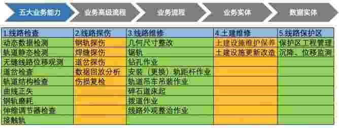 在轨道运维业务中,,,,,,我们形成了完整的从业务能力(业务域)-业务流程-业务实体-数据模型的分析梳理过程。。。。。。。轨道运维业务能力如下图所示::::::::::::
