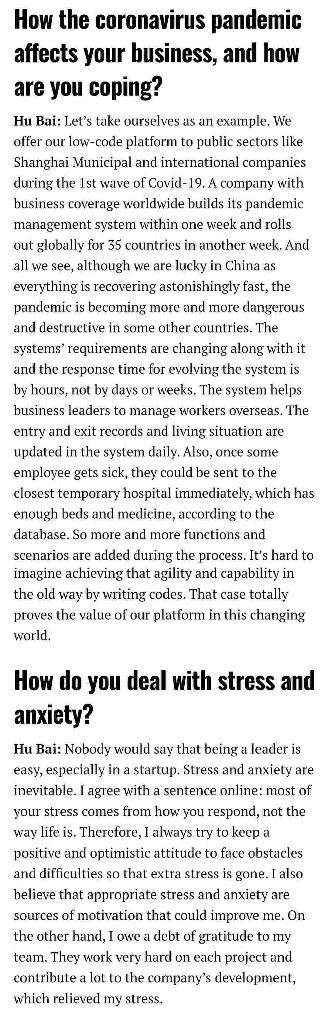 2021年年初,,,,,,,,,,,,爱湃斯科技CEO胡柏受邀接受法媒Startup.info的专访,,,,,,,与Startup info的读者分享了自己的创业经历、、、、、、以及低代码平台小微钱包的创新之处。。。。。。。。。。。。。