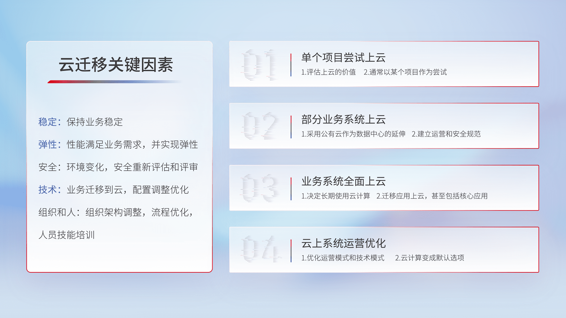 结合实际业务,,,,从规划设计、、、云平台选型、、、、云原生改造、、、数据迁移、、、集成交付,,,,迁移全过程为客户识别最佳上云路径,,,做好风险识别管理,,,设计网络架构、、、、身份权限、、、安全审计合规、、、、操作审计、、、、日志审计、、监控告警策略、、、多站点容灾设计等,,,,对云上基础设施进行整体规划,,提升IT治理水平,,,,以满足弹性、、、高可用、、、高性能的需求。。