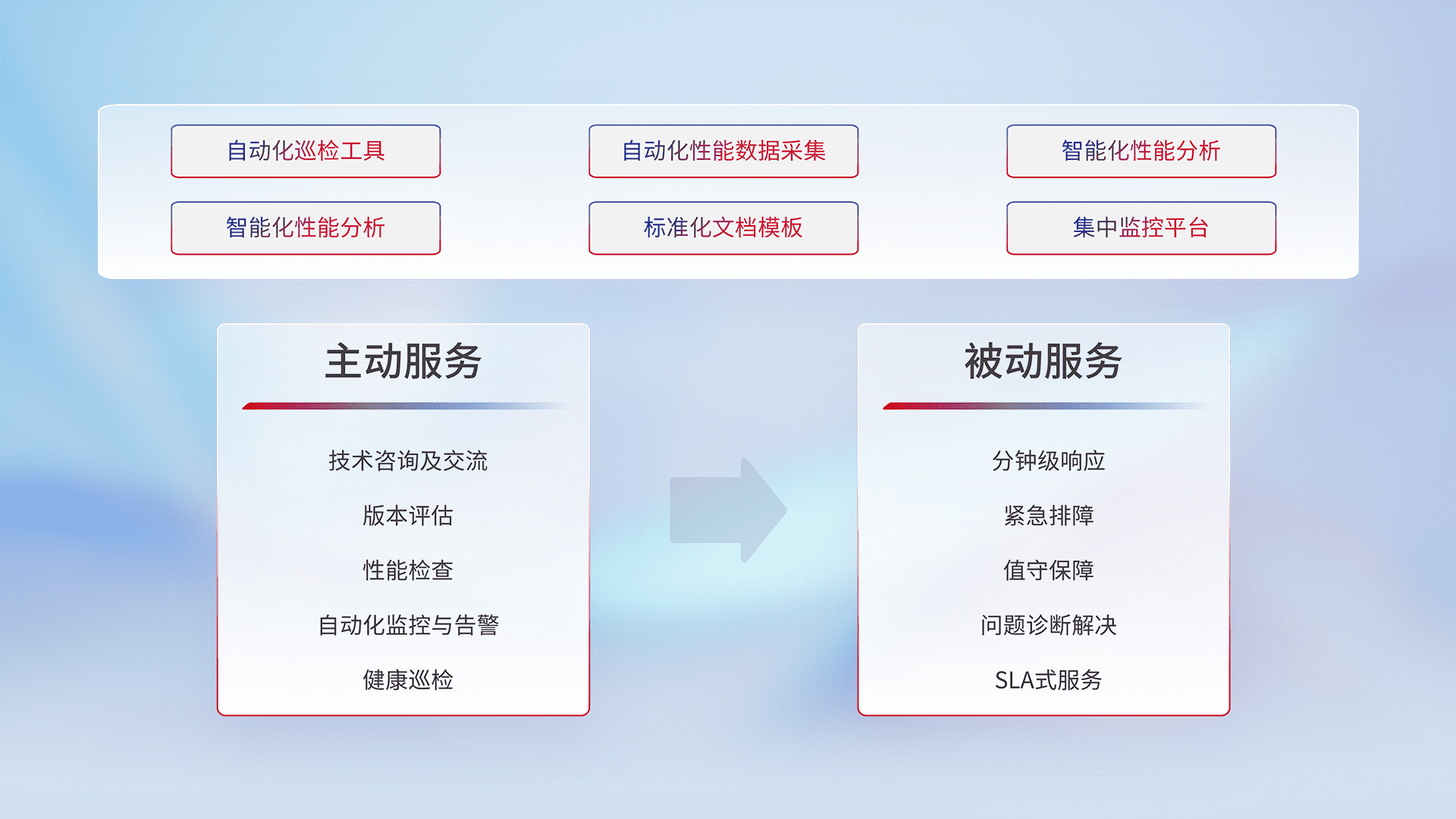 智能化工具和标准化文档,,,,保障服务质量,,,,提供主动服务(包含技术咨询、、、、版本评估、、、、性能检查、、、、自动化监控与告警、、、健康巡检)和被动服务包含(分钟级响应、、紧急排障、、、值守保障、、、、问题诊断解决、、、SLA服务)。。